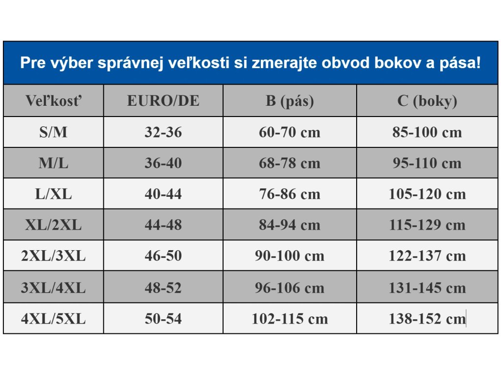 Upozornenie: Pri výbere veľkosti si odmerajte pás(B), boky (C) a následne si vyberte veľkosť.